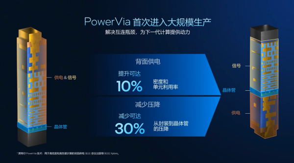 RibbonFET全环绕栅极晶体管采用了4条垂直堆叠的纳米带(NanoRibbons)结构,让栅极能够从四面包电流通道完全环抱起来,不仅可以增强晶体管开关控制、响应速度,抑制漏电,同时也具备更好地可扩展性、设计灵活性,由此实现在同一个工艺平台上围绕高性能、低功耗等不同优化方向设计多种晶体管规格。PowerVia背部供电将位于晶圆正面的供电电路转移到了背面,将标准单元利用率和晶体管密度提升可达10%,将压降(IRDrop)减少多达30%,将芯片运行效率最高提升6%。