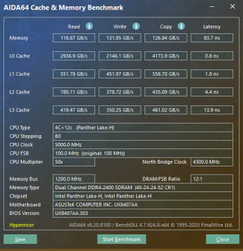 评测机搭载了32GB的LPDDR5x-9600MT/s内存,性能确实强大。通过测试,读取速度达到了118.67GB/s,写入速度达到131.85GB/s,拷贝速度为126.84GB/s,延迟仅为83.7ns。出色的内存对于内容创作者、游戏玩家或者有AI体验需求的用户而言,带来的提升就不用多说了。