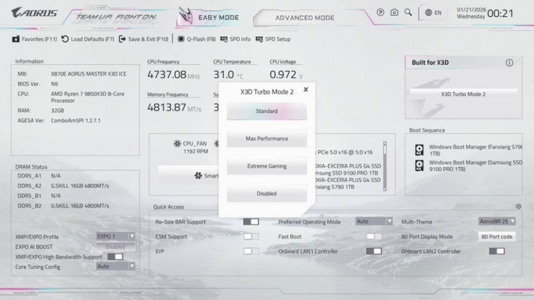 而作为专为AMD的X3D系列处理器打造的主板,这块技嘉X870E AORUS Master X3D ICE上还配备了独创的X3D Turbo模式2.0。可让玩家在BIOS中切换游戏模式与性能模式,获得更强的游戏和多任务处理性能。内置的AI模型和硬件电路,还能实时动态优化X3D处理器的参数,显著提升其性能表现,让玩家获得更流畅的游戏体验。