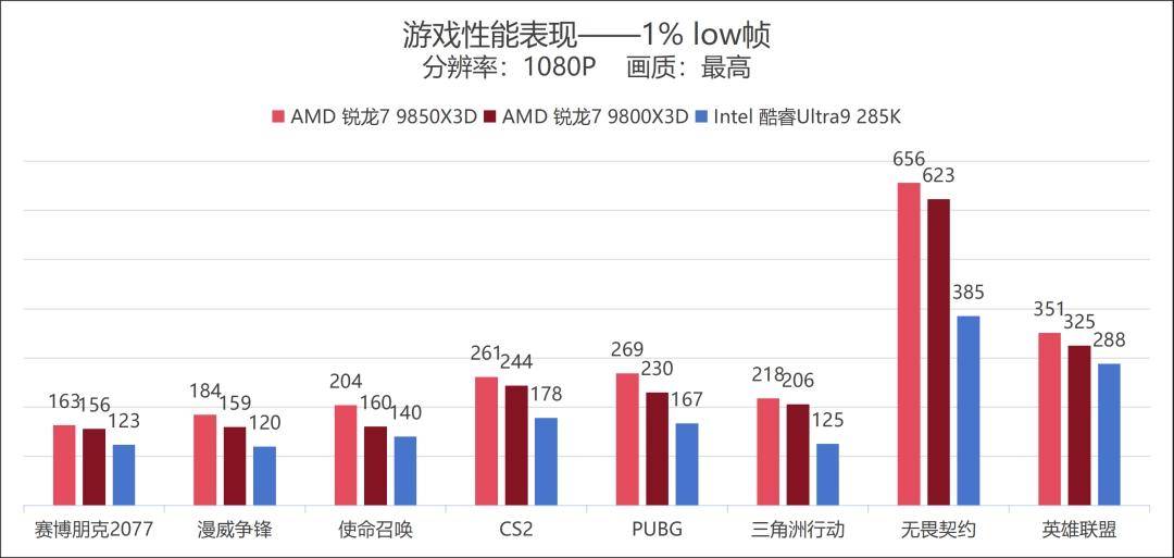 测试游戏的1%low帧,结果也大差不差。对比Intel酷睿Ultra9 285K,AMD锐龙7 9850X3D的平均提升能达到50%,其中《漫威争锋》《PUBG》《三角洲行动》和《无畏契约》,这几款游戏在AMD锐龙7 9850X3D上的提升能分别达到53%、61%、74%和70%,其他游戏最低也有22%的提升,可以说是对蓝厂带来了降维打击。而对比AMD锐龙7 9800X3D,提升幅度平均也能达到11%,如果你想追求极致电竞体验的玩家,这样的提升也是值得考虑更新换代的。